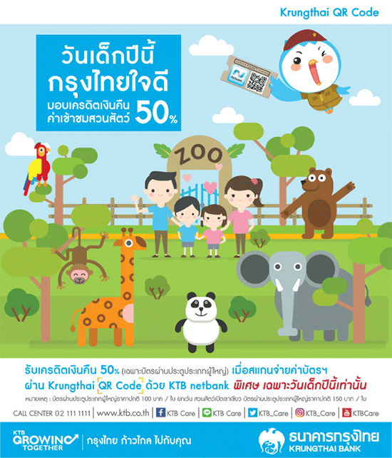 วันเด็กปีนี้ กรุงไทยใจดี มอบเครดิตเงินคืนค่าเข้าชมสวนสัตว์ 50% (เฉพาะบัตรผ่านประตูผู้ใหญ่) เมื่อสแกนจ่ายบัตรฯ ผ่าน Krungthai QR Code ด้วย KTB netbank พิเศษ เฉพาะวันเด็กปีนี้เท่านั้น