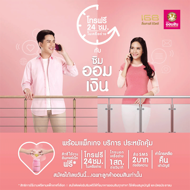 ธนาคารออมสิน ให้คุณออมค่าโทรเป็นเงิน โทรหากันฟรี 24 ชม. ลูกค้าของธนาคารออมสิน สามารถติดต่อขอรับซิม 168 (ออมค่าโทรเป็นเงิน) ได้ที่ธนาคารออมสินทุกสาขา โดยไม่มีค่าใช้จ่าย