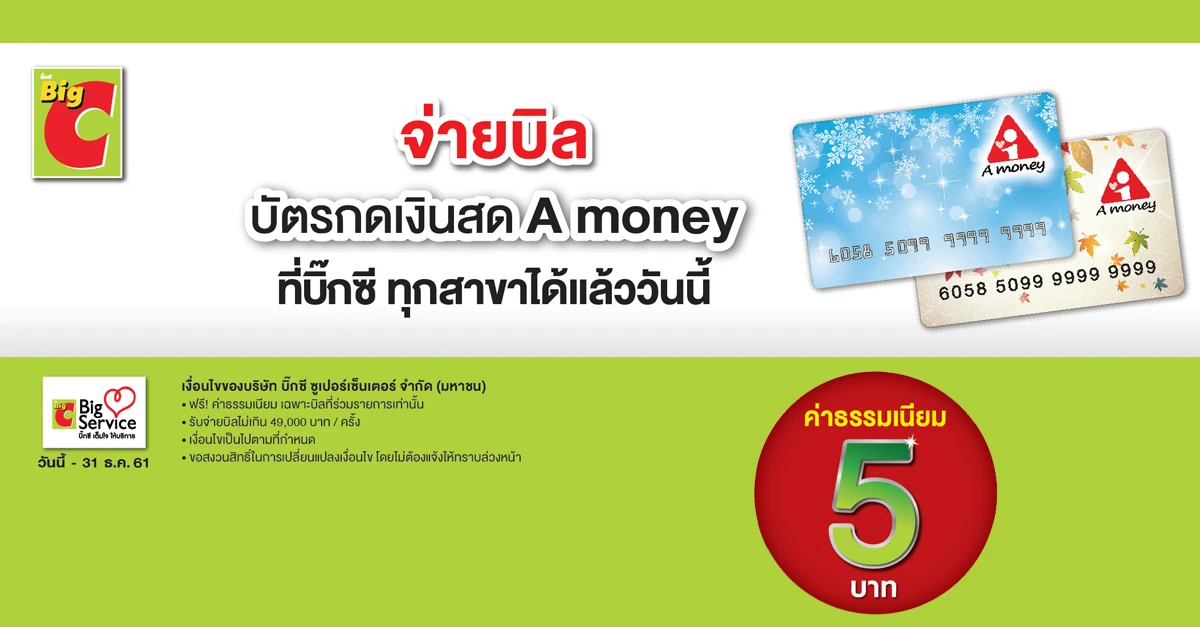 จ่ายบิล!! บัตรกดเงินสด A money  บัดดี้เรื่องเงิน ที่บิ๊กซี ทุกสาขาได้แล้ววันนี้ ค่าธรรมเนียมเพียง 5 บาท จากปกติ 10 บาท ระยะเวลาโปรโมชั่น ตั้งแต่วันนี้ - 31 ธันวาคม 2561