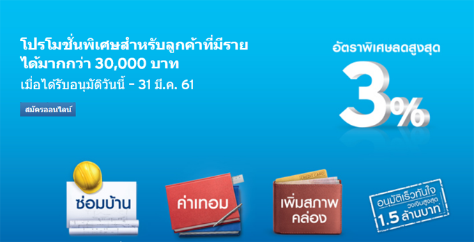 สำหรับลูกค้าที่เป็นเจ้าหน้าที่ข้าราชการ หรือพนักงานรัฐวิสาหกิจ และพนักงานบริษัทมหาชน ที่มีรายได้ตั้งแต่ 30,000 บาท/เดือน เท่านั้น