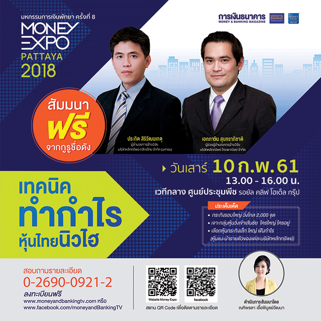 งานมหกรรมการเงินพัทยา ครั้งที่ 8 Money Expo Pattaya 2018 แบงก์/บล./บลจ./ประกันประเดิมโปรโมชั่นพิเศษตั้งแต่ต้นปี แข่งดอกเบี้ยเงินกู้ 0% - เงินฝากดอกเบี้ยสูง เจาะกลุ่มผู้สูงวัยด้วยสินเชื่อบ้าน Reverse Mortgage ดอกเบี้ย 0% นานสูงสุด 2 ปี สัมมนาฟรี "เทคนิคทำกำไรหุ้นไทยนิวไฮ" รับดัชนีหุ้นทะลุ 1,800 วันที่ 9-11 กุมภาพันธ์นี้ ที่ศูนย์ประชุมพีช พัทยา จ.ชลบุรี