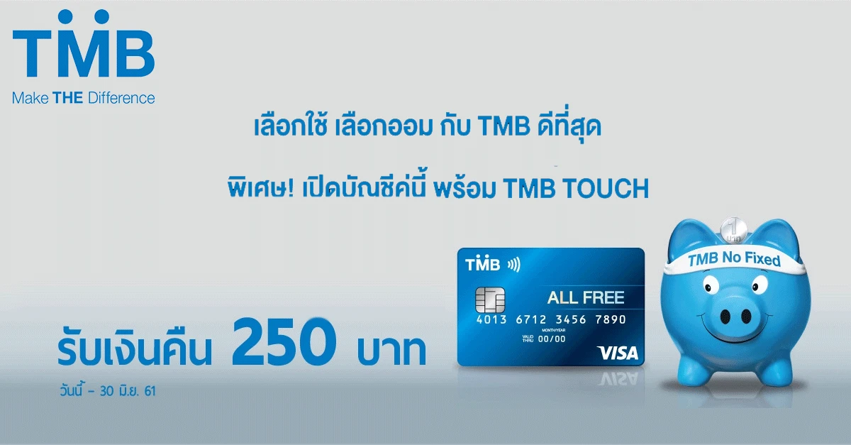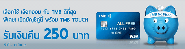 - โปรโมชั่นสำหรับลูกค้าเดิมที่มีบัญชี TMB No Fixed อยู่แล้ว เพียงเปิดบัญชี TMB All Free พร้อมบัตรเดบิตใหม่ ใน ระหว่างวันที่ 1 ก.พ. - 30 มิ.ย. 2561และเปิดใช้งาน TMB TOUCH Mobile App ภายในวันเดียวกัน