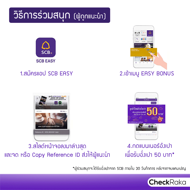 - ผู้ถูกแนะนำจะได้รับอั่งเปามูลค่า 50 บาท โดยต้องกดรับสิทธิ์ใน SCB EASY Application ในหน้า EASY Bonus ภายในระยะเวลาแคมเปญ ทั้งนี้ หากผู้ถูกแนะนำไม่กดรับสิทธิภายในระยะเวลาดังกล่าว ถือว่าสละสิทธิ์