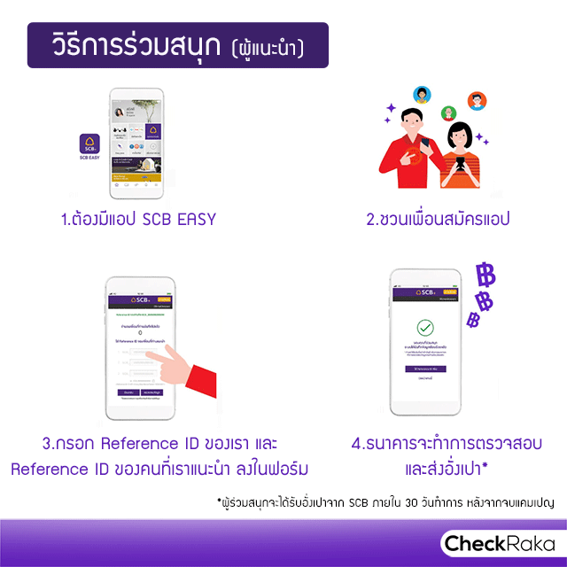 - ผู้แนะนำจะต้องบันทึกข้อมูลของผู้ถูกแนะนำลงในแบบฟอร์มที่ธนาคารกำหนด โดยการคลิก link ผ่าน SCB Thailand ในแอพพลิเคชั่น LINE หรือเข้าหน้า URL scbeasyangpao.scb.co.th ต่อจากนั้น ผู้แนะนำต้องกรอก Reference ID 13 หลักของตนเองในช่องผู้แนะนำ และกรอก Reference ID ของผู้ถูกแนะนำในช่องผู้ถูกแนะนำ (ผู้แนะนำสอบถามข้อมูลจากผู้ถูกแนะนำ) ทั้งนี้ ผู้แนะนำสามารถเข้าไปเพิ่มผู้ถูกแนะนำได้ตั้งแต่วันที่ 17 ก.พ. 2561 จนถึงวันที่ 31 มี.ค. 2561 เวลา 23.00 น.