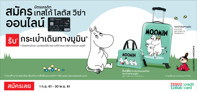 สมัครบัตรเครดิตเทสโก้ โลตัส วีซ่า ออนไลน์ วันนี้ รับกระเป๋าเดินทางมูมิน ขนาด 20 นิ้ว มูลค่ารวม 7,980 บาท