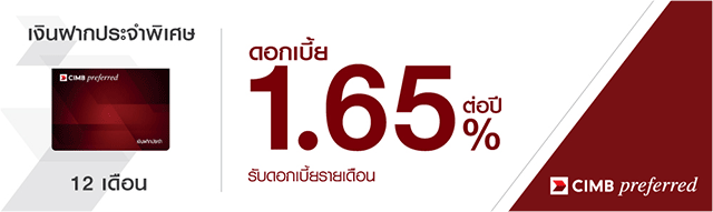 บัญชีเงินฝากประจำพิเศษ 12 เดือน Preferred* สำหรับลูกค้า CIMB Preferred : อัตราดอกเบี้ย 1.65% ต่อปี