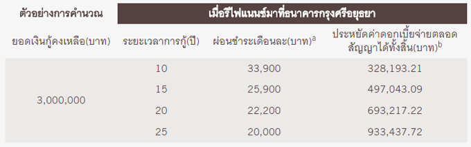 a. คำนวณจากการผ่อนสินเชื่อบ้านกรุงศรีรีไฟแนนซ์ อัตราดอกเบี้ย : ปีที่ 1 คงที่ 2.90% ต่อปี, ปีที่ 2 คงที่ 3.90% ต่อปี, ปีที่ 3 คงที่ 4.90% ต่อปี หลังจากนั้น MRR - 2.35% ต่อปี
