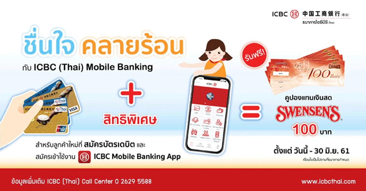 ชื่นใจ คลายร้อน กับ ICBC (Thai) Mobile Banking สำหรับลูกค้าใหม่ที่สมัครบัตรเดบิต และสมัครเข้าใช้งาน ICBC Mobile Banking App รับฟรี!คูปอง Swensen's 100 บาท