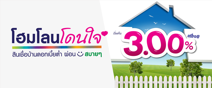 โฮมโลนโดนใจ สินเชื่อบ้านดอกเบี้ยต่ำ ผ่อนสบายๆ เริ่มต้น 3.00% เฉลี่ย 3 ปี