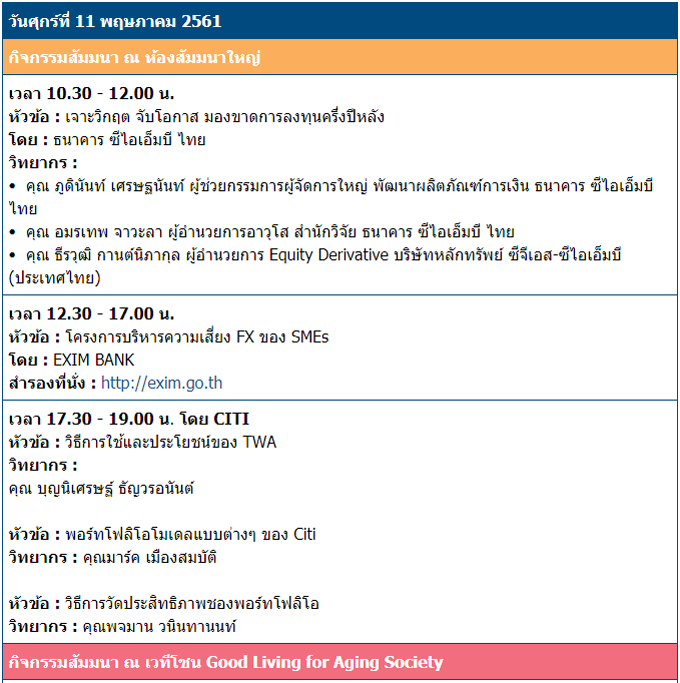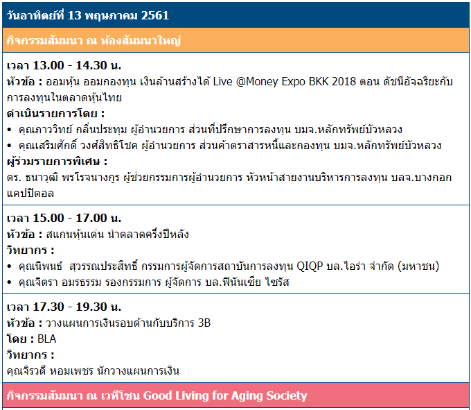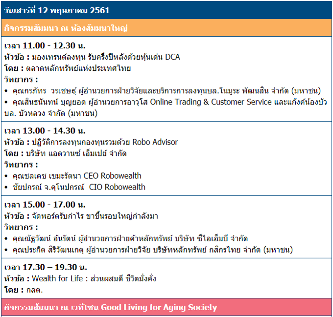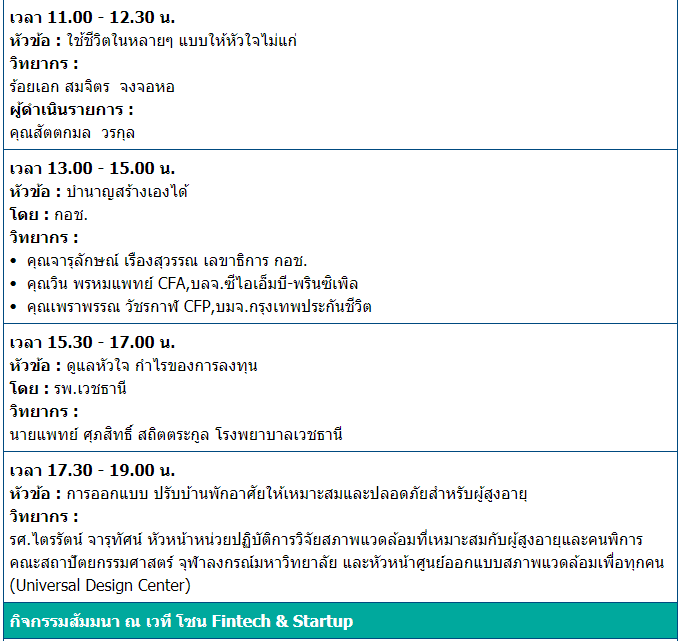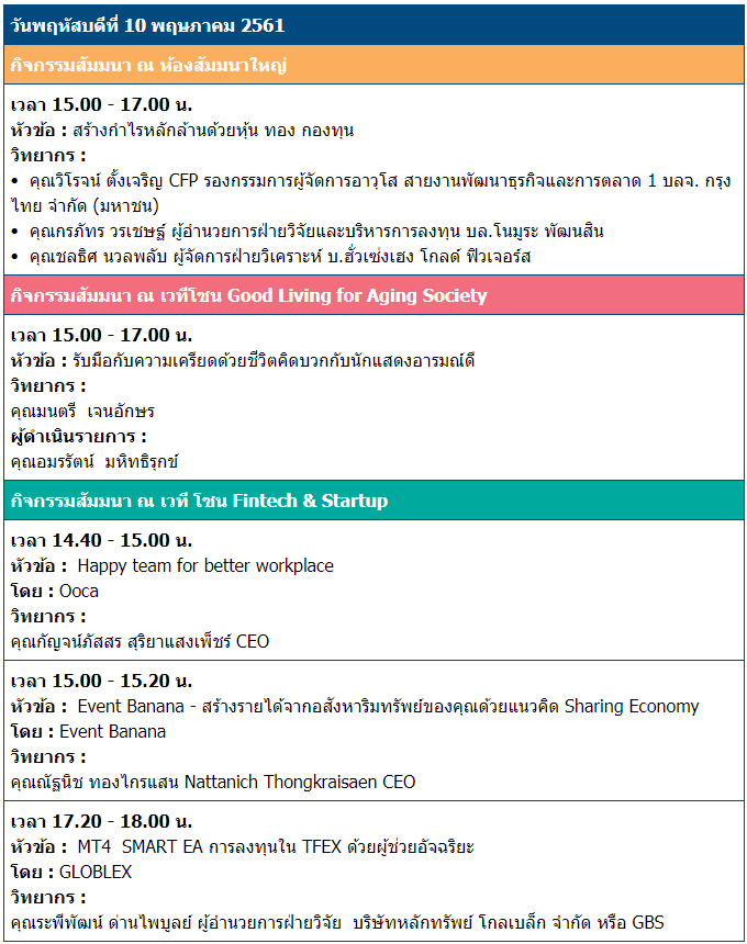 "โซน Good Living for Aging Society เป็นการรองรับ "สังคมผู้สูงวัย" ที่กำลังมาถึงประเทศไทยในปีหน้านี้แล้ว โดยต่อยอดจากโซนตลาดเงินตลาดทุนเพื่อส่งเสริมการวางแผนชีวิตและการวางแผนการเงินในระยะยาวตั้งแต่ วัยทำงาน วัยเกษียณ เพื่อการใช้ชีวิตอย่างมีไลฟ์สไตล์และมีความสุข เป็นมิติใหม่ที่สังคมไทยจะต้องเริ่มต้นตั้งแต่วันนี้"