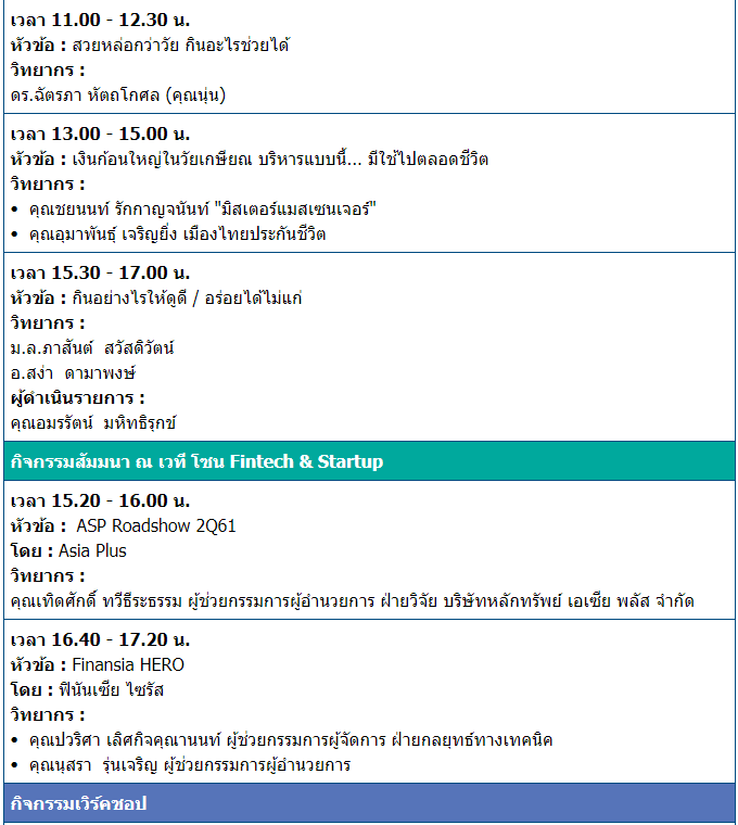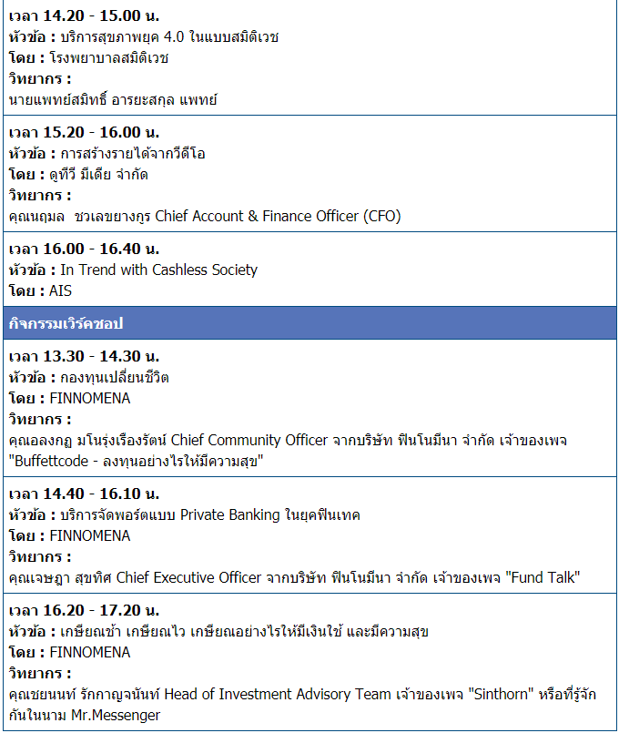 - เวลา 14.20 - 15.00 น. โมสต์ วิศรุต หิมรัตน์ บูธ บมจ.เมืองไทยประกันชีวิต