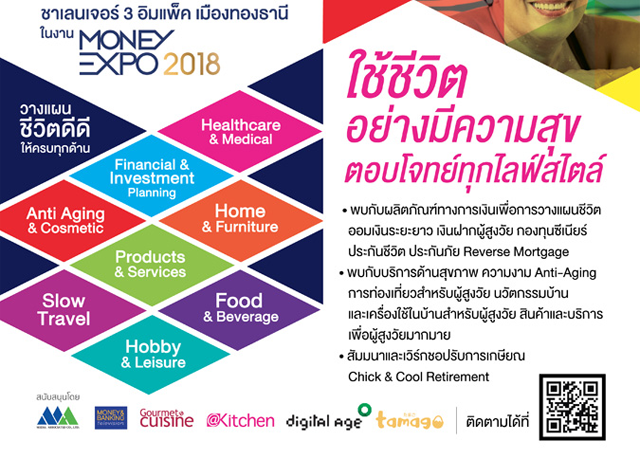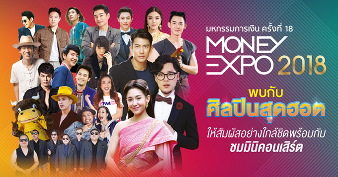 งานมหกรรมการเงิน ครั้งที่ 18 Money Expo 2018 จัดยิ่งใหญ่ในแนวคิด "Wealth Transformation มิติใหม่แห่งความมั่งคั่ง" เปิด 9 โซนบริการการเงินการลงทุนครบวงจร พร้อมโปรโมชั่นพิเศษจากธนาคาร สถาบันการเงิน องค์กรภาครัฐและเอกชนกว่า 200 แห่ง เพิ่มโซนใหม่ "Good Living for Aging Society" เพื่อวางแผนชีวิตและวางแผนการเงินในระยะยาว รองรับสังคมผู้สูงอายุ วันที่ 10 - 13 พฤษภาคม 2561 อาคารชาเลนเจอร์ 2 - 3 อิมแพ็ค เมืองทองธานี