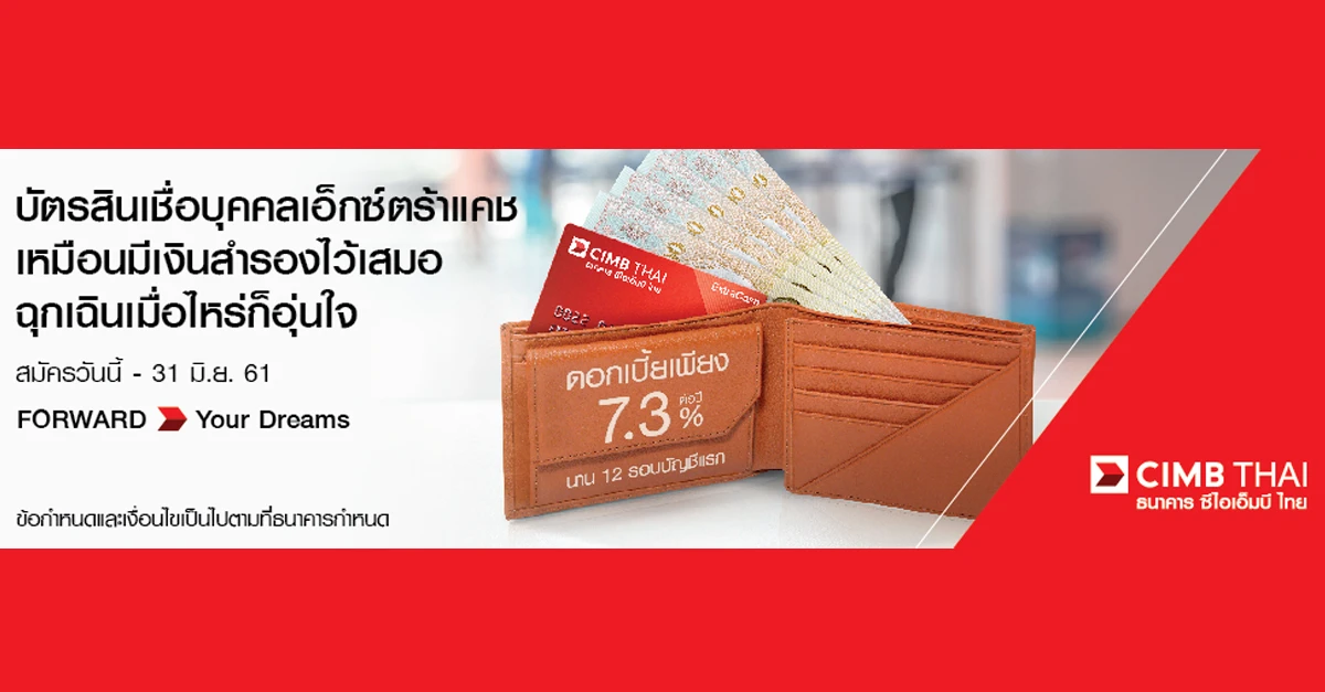 ข้อกำหนดและเงื่อนไขสิทธิพิเศษนี้เฉพาะลูกค้าใหม่ที่สมัครบัตรสินเชื่อบุคคลเอ็กซ์ตร้าแคช ของ ธนาคาร ซีไอเอ็มบี ไทย จำกัด (มหาชน)("ธนาคาร") ระหว่างวันที่ 15 มี.ค. - 31 ธ.ค. 61