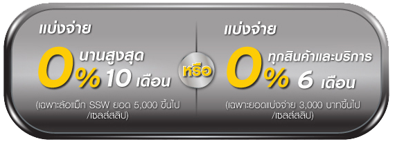 • แบ่งจ่าย 0% นานสูงสุด 10 เดือน (เฉพาะล้อแม็ก SSW ยอด 5,000 บาทขึ้นไป/เซลล์สลิป) หรือ