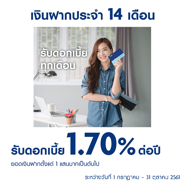1. อัตราดอกเบี้ยพิเศษนี้สำหรับลูกค้าประเภทบุคคลธรรมดา ที่มาเปิดบัญชีประเภทเงินฝากประจำ ระยะเวลาฝาก 14 เดือน ด้วยยอดเงินฝากตั้งแต่ 100,000 บาท ระหว่างวันที่ 1 กรกฎาคม - 31 ตุลาคม 2561