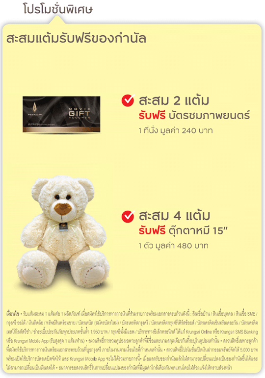 - สะสมครบ 4 แต้ม รับฟรี ตุ๊กตาหมี 15 นิ้ว 1 ตัวมูลค่า 480 บาท