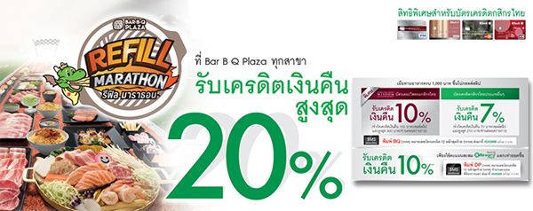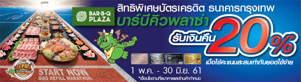 รายละเอียดโปรโมชั่น : รับเครดิตเงินคืนสูงสุด 20% ที่ Bar-B-Q Plaza ทุกสาขา