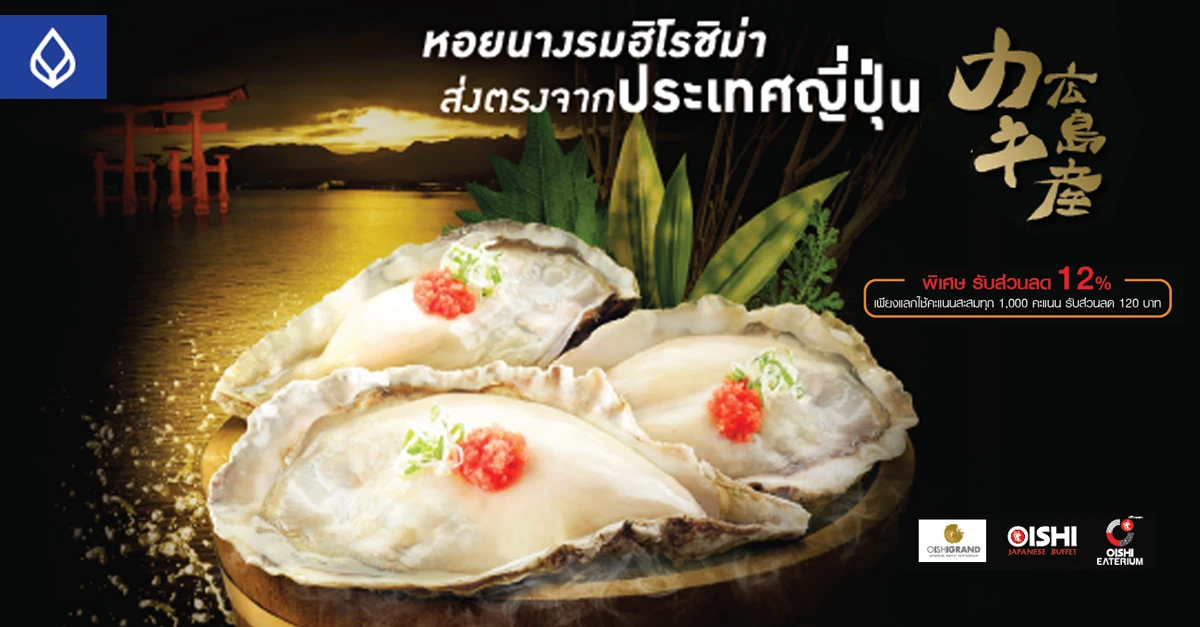 พิเศษ! รับส่วนลด 12% เพียงแลกใช้คะแนนสะสมทุกๆ 1,000 คะแนน รับส่วนลด 120 บาท ที่ร้านโออิชิ แกรนด์, โออิชิ บุฟเฟ่ต์, โออิชิ อีทเทอเรียม