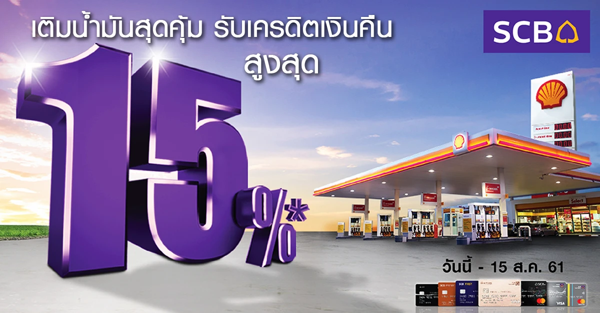 เติมน้ำมันสุดคุ้ม รับเครดิตเงินคืนสูงสุด 15% ที่สถานีบริการน้ำมันเชลล์ทั่วประเทศ จากบัตรเครดิต SCB