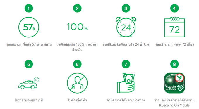 • หลักเกณฑ์และเงื่อนไขอื่นๆ เป็นไปตามที่ บจก. ลีสซิ่งกสิกรไทย กำหนด