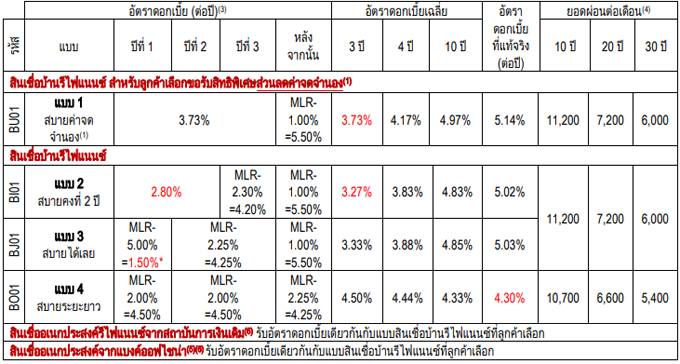 (3) อัตราดอกเบี้ยคำนวณจากดอกเบี้ย MLR = 6.50% ณ วันที่ 2 ก.ค. 2558 อนึ่ง ธนาคารสามารถประกาศปรับเปลี่ยนอัตราดอกเบี้ย MLR ได้ ตามเกณฑ์ที่ธนาคารแห่งประเทศไทยกำหนดอนุญาตไว้ โดยทางธนาคารจะประกาศเป็นคราวๆ ไป และจะประกาศทางเว็บไซต์ของธนาคาร และ/หรือปิดประกาศไว้ที่ตั้งสาขาของธนาคาร และอัตราดอกเบี้ยที่สูงขึ้นอาจทำให้จำนวนเงินค่างวดหรือจำนวนงวดในการผ่อนชำระเพิ่มมากขึ้นได้