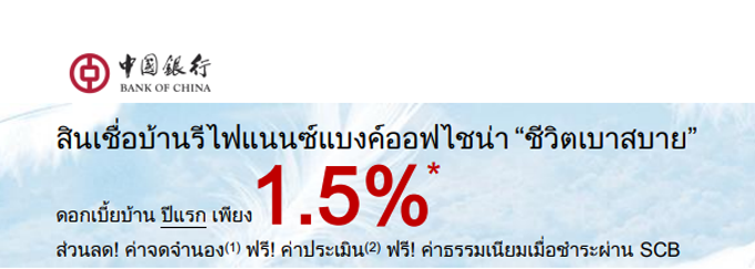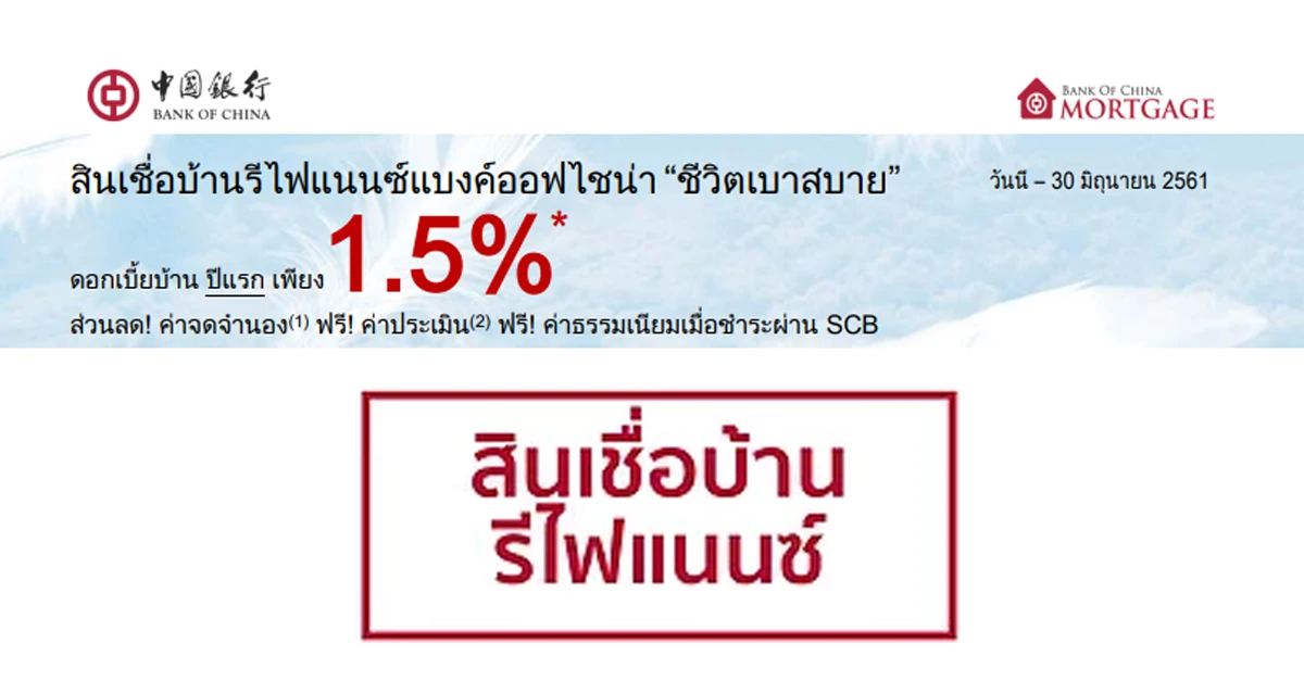 สินเชื่อบ้านรีไฟแนนซ์แบงค์ออฟไชน่า "ชีวิตเบาสบาย" ดอกเบี้ยบ้านปีแรกเพียง 1.5%