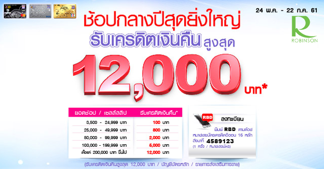 ช้อปกลางปีสุดยิ่งใหญ่ รับเครดิตเงินคืนสูงสุด 12,000 บาท เมื่อมียอดช้อปสะสม ที่ห้างสรรพสินค้าโรบินสันทุกสาขา จาก