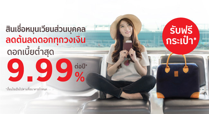 สินเชื่อหมุนเวียนส่วนบุคคล ลดต้นลดดอกทุกวงเงิน ดอกเบี้ยต่ำสุด 9.99% ต่อปี พร้อมรับฟรี! กระเป๋า