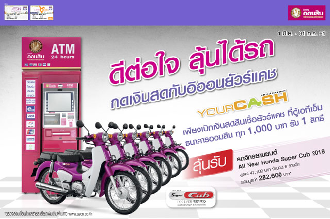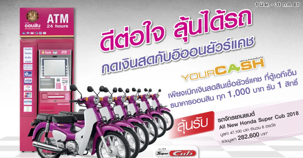 รับ 1 สิทธิ์ ลุ้นรับรถจักรยานยนต์ All New Honda Super Cub 2018 มูลค่า 47,100 บาท เมื่อมียอดเบิกถอนเงินสดอิออนยัวร์แคชผ่านตู้เอทีเอ็ม ธนาคารออมสิน ทุก 1,000 บาท ต่อเซลล์สลิป ในระหว่างวันที่ 1 มิถุนายน 2561 - 31 กรกฎาคม 2561 (โดยไม่ต้องลงทะเบียนเข้าร่วมรายการส่งเสริมการขายทาง SMS)