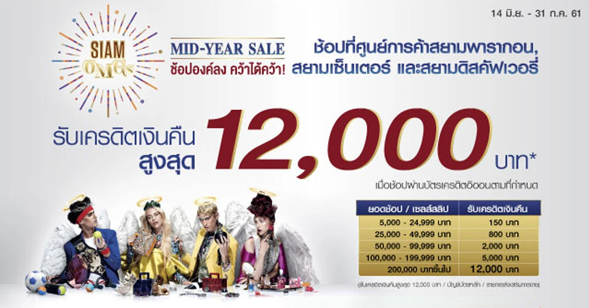 Siam OMGs Mid Year Sale 2018 รับเครดิตเงินคืนสูงสุด 12,000 บาท เมื่อช้อปที่ศูนย์การค้าสยามพารากอน สยามเซ็นเตอร์ และสยามดิสคัฟเวอรี่ (ยกเว้นห้างสรรพสินค้า) ผ่าน
