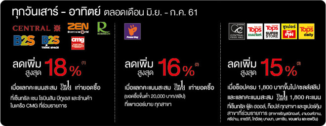 ลดเพิ่มสูงสุด 18% ณ ร้านค้าในเครือ Central Group ที่ร่วมรายการ ผ่านบัตรเครดิตเซ็นทรัล เดอะวัน
