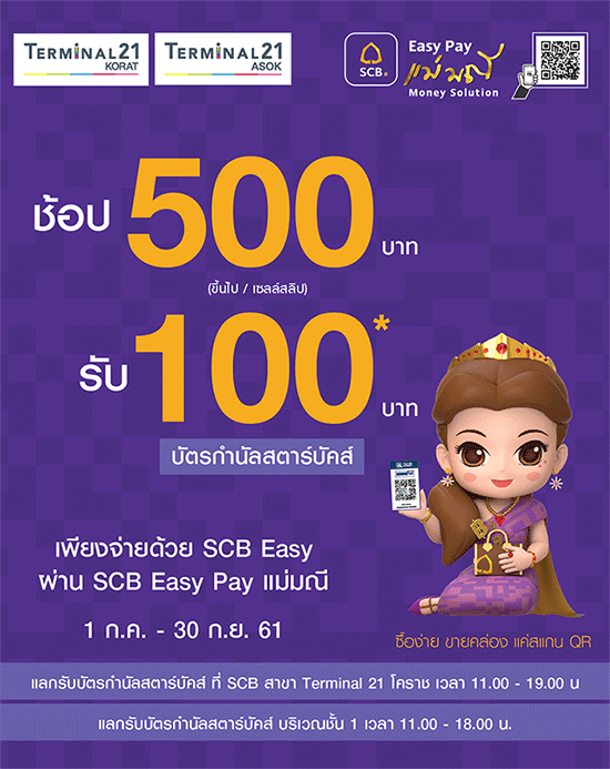 ซื้อง่าย ขายคล่อง แค่สแกน QR เพียงจ่ายด้วย SCB Easy ผ่าน SCB Easy Pay แม่มณี ช้อป 500 บาทขึ้นไป/เซลล์สลิป กับร้านค้าที่ร่วมรายการใน Terminal 21 อโศก และ Terminal 21 โคราช รับบัตรกำนัลสตาร์บัคส์ 100 บาท*