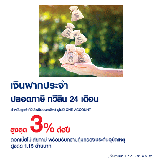 ข้อกำหนดและเงื่อนไข - รายการส่งเสริมการขายนี้สำหรับลูกค้าบุคคลธรรมดาที่มีบัญชีออมทรัพย์ ยูโอบี ONE ACCOUNT และเปิดบัญชีฝากประจำทวีสิน ระหว่างวันที่ 1 ก.ค. - 31 ธ.ค. 61