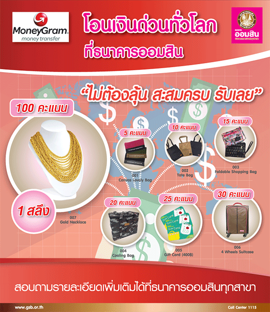โปรโมชั่นพิเศษ! สำหรับลูกค้าที่ทำธุรกรรมโอนเงินต่างประเทศผ่าน MoneyGram Money Tranfer ที่ธนาคารออมสิน 1 ธุรกรรมมีค่าเท่ากับ 1 คะแนน สะสมครบ แลกรับของรางวัลได้เลย สูงสุด 100 คะแนน รับเลยสร้อยคอทองคำหนัก 1 สลึง หรือรับของรางวัลอื่นๆ อีกมากมาย