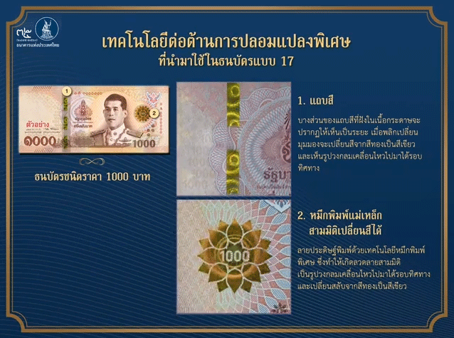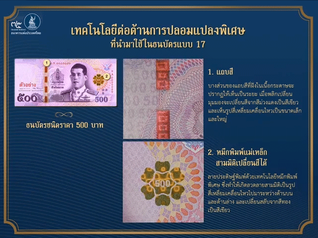 - แถบสีที่ฝังในเนื้อกระดาษจะมีบางส่วนปรากฏให้เห็นเป็นระยะ เมื่อเปลี่ยนมุมมองจะเปลี่ยนสี และเห็นรูปเคลื่อนไหว