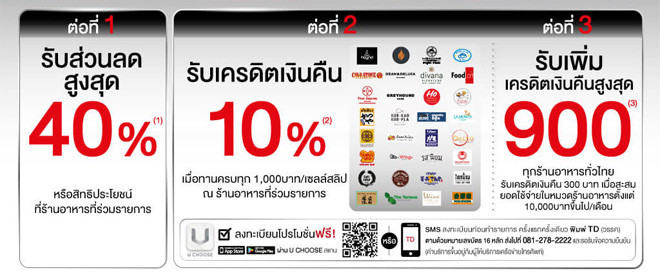 • ต่อที่ 3 รับเพิ่ม! เครดิตเงินคืนสูงสุด 900 บาท ทุกร้านอาหารทั่วไทย (รับเครดิตเงินคืน 300 บาท เมื่อสะสมยอดใช้จ่ายในหมวดร้านอาหารตั้งแต่ 10,000 บาทขึ้นไป/ เซลล์สลิป)