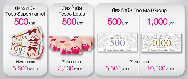 - บัตรกำนัล Tesco Lotus 500 บาท เมื่อใช้คะแนนสะสม 5,500 คะแนน