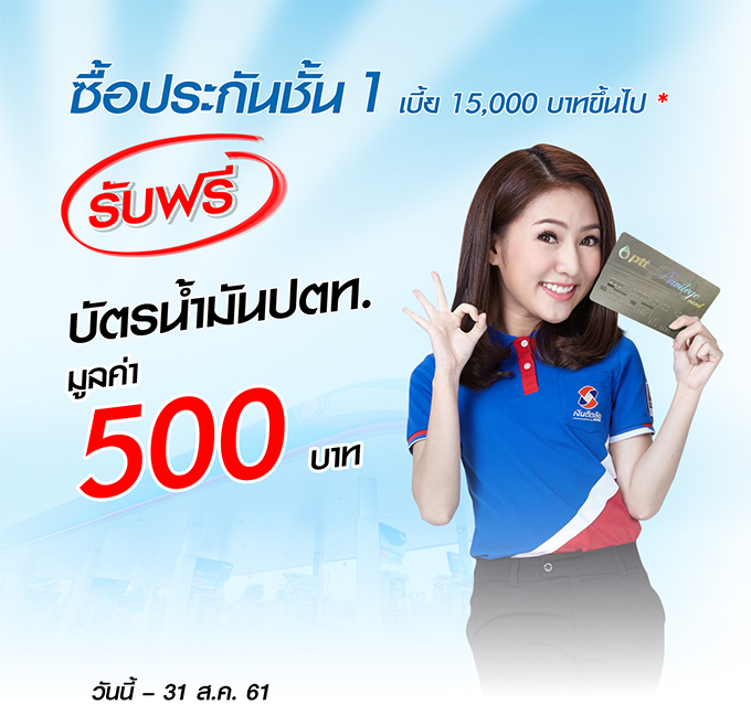 • สำหรับลูกค้าเฉพาะ 4 ล้อ (กระบะ, เก๋ง และรถตู้) ที่ซื้อประกันภัยรถยนต์ภายในวันที่ 1ก.ค. - 31 ส.ค.2561 เบี้ยประกันตั้งแต่ 15,000 บาท ขึ้นไป รับฟรี! บัตรเติมน้ำมันปตท. มูลค่า 500 บาท