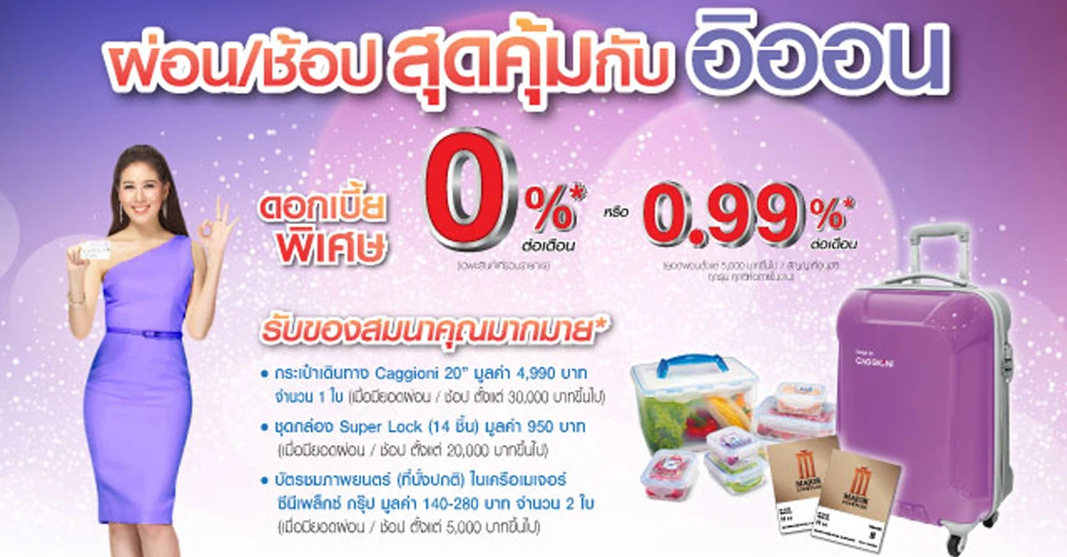 • ดอกเบี้ยพิเศษ 0%* (เฉพาะสินค้าที่ร่วมรายการ) หรือ ดอกเบี้ย 0.99%* ต่อเดือน (ทุกรุ่น ทุกยี่ห้อ ภายในงาน)