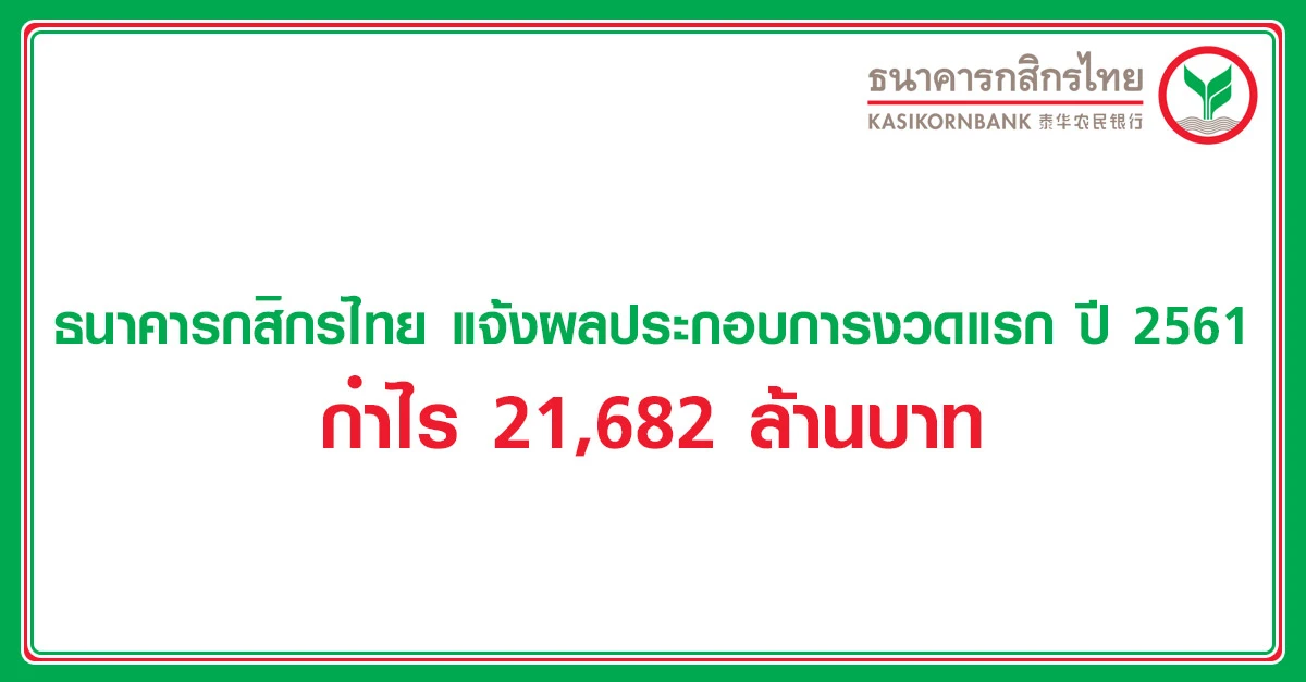 ธนาคารกสิกรไทย แจ้งผลประกอบการงวดแรก ปี 2561 กำไร 21,682 ล้านบาท