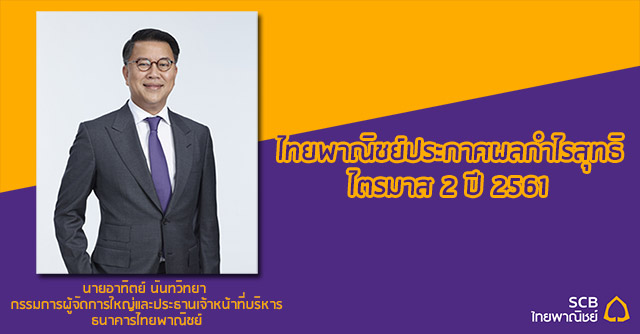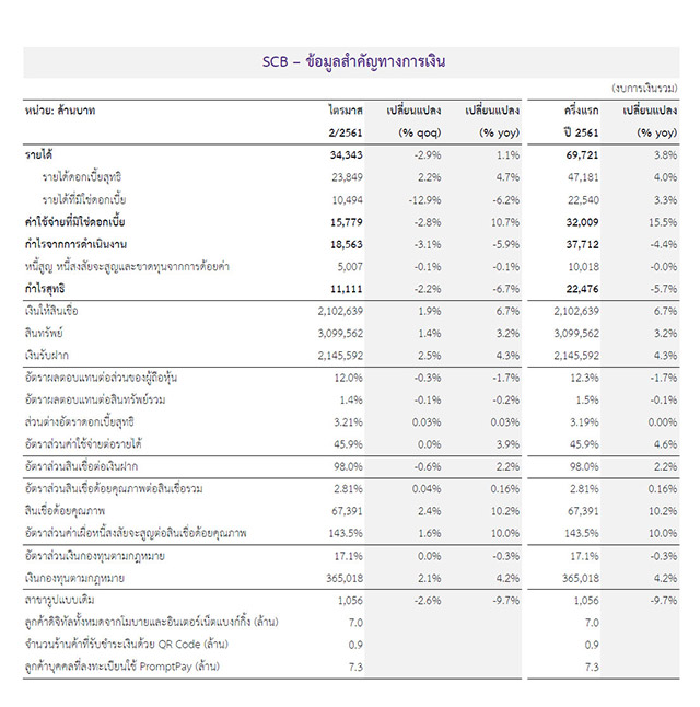 ธนาคารไทยพาณิชย์และบริษัทย่อยมีรายได้จากการดำเนินงานจำนวน 34,343 ล้านบาทในไตรมาส 2 ปี 2561 เพิ่มขึ้น 1.1% จากปีก่อน จากการขยายตัวของรายได้ดอกเบี้ยสุทธิ 4.7% ถึงแม้ว่ารายได้ที่มิใช่ดอกเบี้ยปรับตัวลดลง อย่างไรก็ตาม การลงทุนตามยุทธศาสตร์ของธนาคารภายใต้โครงการ SCB Transformation ส่งผลให้ค่าใช้จ่ายในการดำเนินงานเพิ่มขึ้น และส่งผลให้กำไรสุทธิไตรมาส 2 ปี 2561 (งบการเงินรวมก่อนตรวจสอบ) มีจำนวน 11,111 ล้านบาท ปรับตัวลดลง 6.7% จากปีก่อน สำหรับครึ่งปีแรกของปี 2561 กำไรสุทธิมีจำนวน 22,476 ล้านบาท
