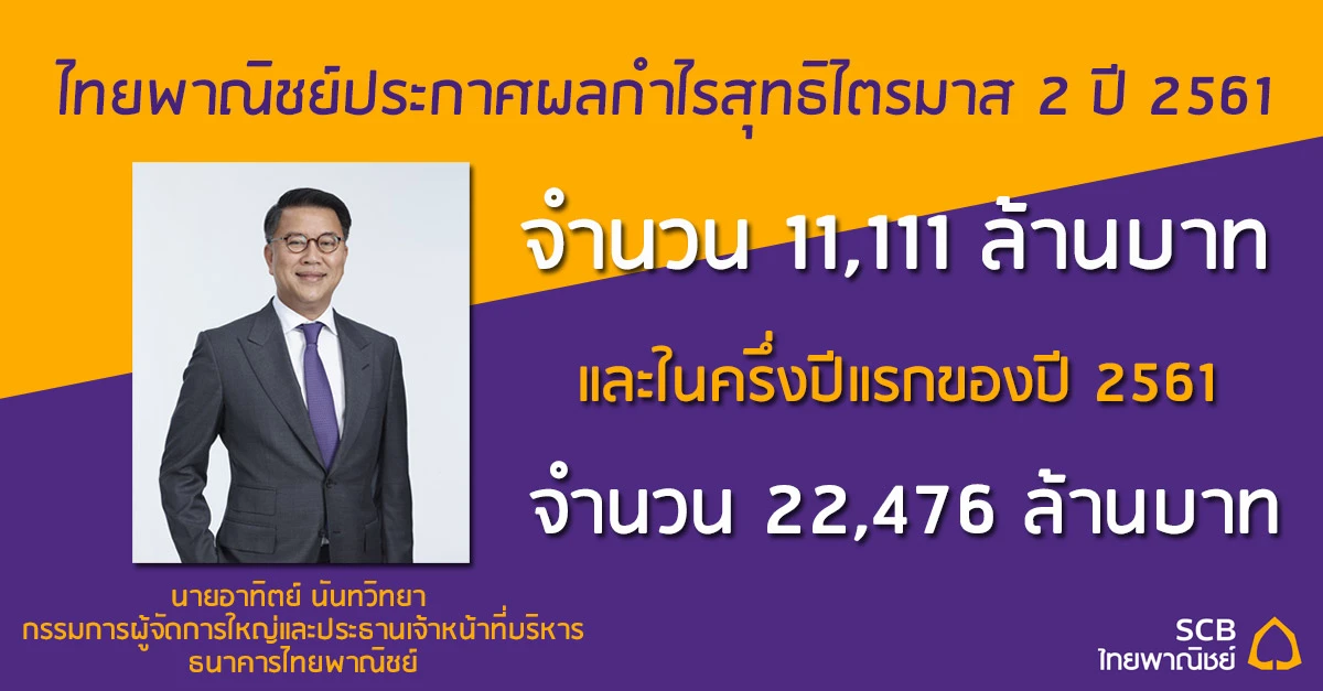 ไทยพาณิชย์ประกาศผลกำไรสุทธิครึ่งปีแรกของปี 2561 จำนวน 22,476 ล้านบาท