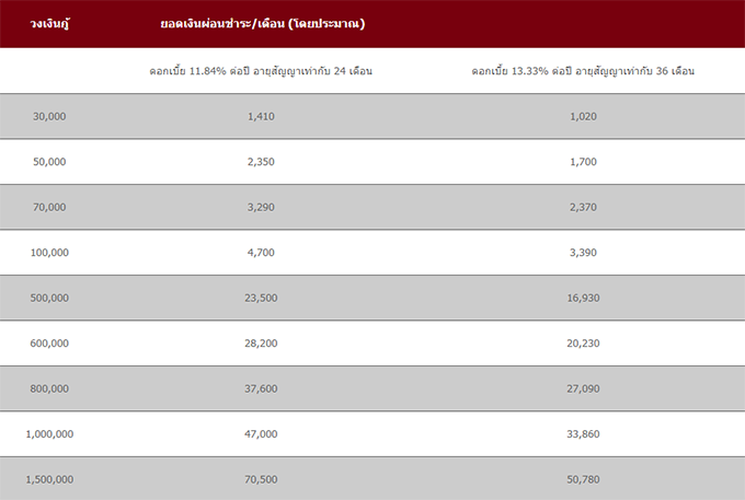 - ดอกเบี้ย 13.33% ต่อปี อายุสัญญาเท่ากับ 36 เดือน สำหรับพนักงานที่มีรายได้ประจำต่อเดือน 50,000 บาทขึ้นไป