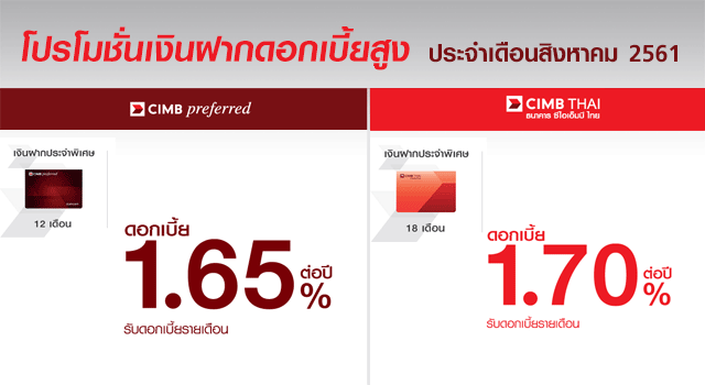 โปรโมชั่นบัญชีเงินฝากดอกเบี้ยสูงประจำเดือนสิงหาคม 2561 จาก ธนาคารซีไอเอ็มบี ไทย บัญชีเงินฝากประจำแบบมีกำหนดระยะเวลาที่ให้ดอกเบี้ยสูง และสามารถเลือกรับดอกเบี้ยแบบรายเดือน หรือเมื่อครบกำหนดได้