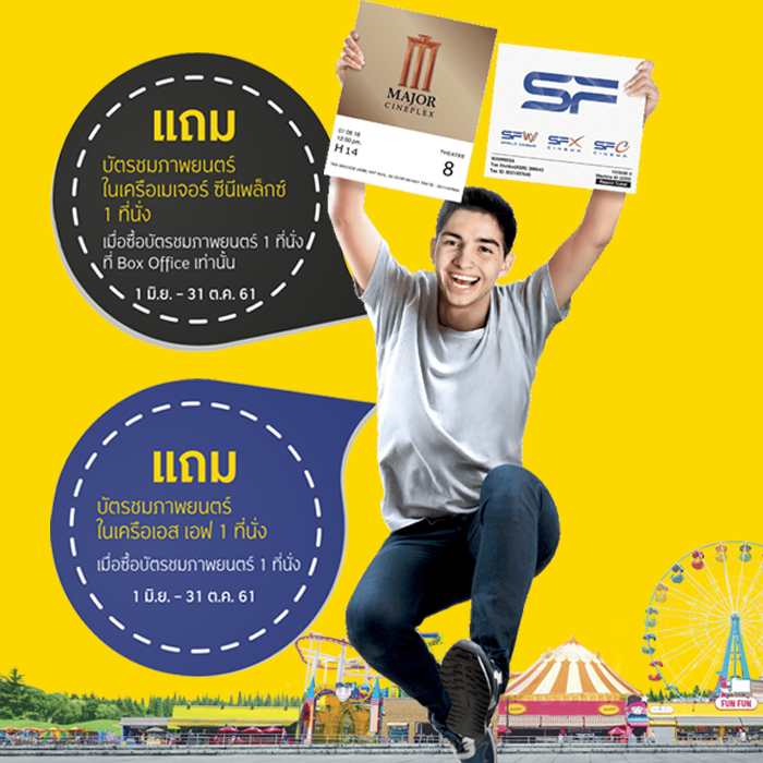 สิทธิพิเศษสำหรับลูกค้าที่ใช้บัตรกรุงศรี เดบิต ชำระค่าบัตรชมภาพยนตร์ในเครือเมเจอร์ ซีนีเพล็กซ์ - รับสิทธิ์ซื้อ 1 ที่นั่ง แถมฟรี 1 ที่นั่ง สำหรับการซื้อบัตรชมภาพยนตร์ที่ Box Office เท่านั้น