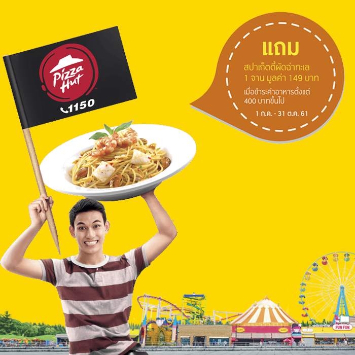 สิทธิพิเศษสำหรับลูกค้าที่ใช้บัตรกรุงศรี เดบิต ชำระค่าอาหารตั้งแต่ 400 บาท ขึ้นไปที่ร้าน Pizza Hut - รับสิทธิ์ ฟรี สปาเก็ตตี้ผัดฉ่าทะเล 1 จาน มูลค่า 149 บาท