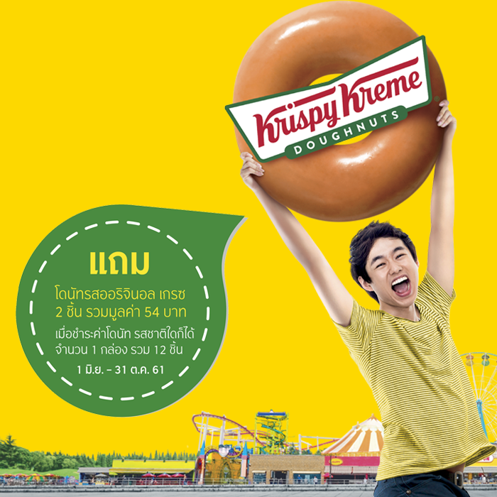 สิทธิพิเศษสำหรับลูกค้าที่ใช้บัตรกรุงศรี เดบิต ชำระค่าโดนัท รสชาติใดก็ได้ จำนวน 1 กล่อง รวม 12 ชิ้น ที่ร้าน Krispy Kreme - รับสิทธิ์ ฟรี โดนัท รสออริจินอล เกรซ 2 ชิ้น รวมมูลค่า 54 บาท