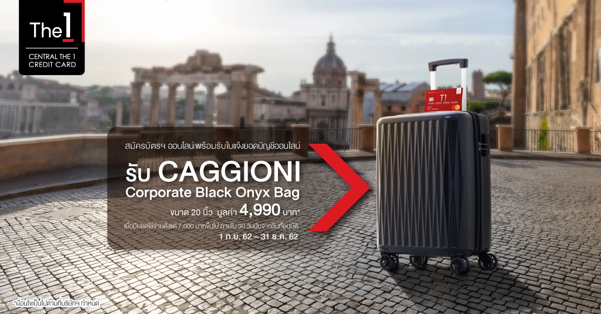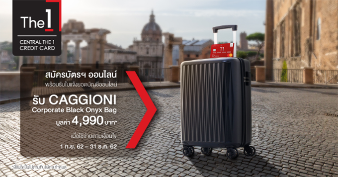 ข้อกำหนดและเงื่อนไข - เฉพาะผู้สมัครบัตรหลักรายใหม่ ของบัตรเครดิต เซ็นทรัล เดอะวัน (ไม่เคยใช้บัตรเครดิต เซ็นทรัล เดอะวัน หรือ ยกเลิกบัตรเครดิตเซ็นทรัล เดอะวัน มาแล้วไม่ต่ำกว่า 6 เดือน) ต้องสมัครบัตรผ่านช่องทางออนไลน์ พร้อมสมัครรับใบแจ้งยอดบัญชีออนไลน์ ระหว่างวันที่ 1 กันยายน 2562 - 31 ธันวาคม 2562 เท่านั้น และผู้สมัครต้องได้รับการอนุมัติภายในวันที่ 31 มกราคม 2563 โดยผู้สมัครจะได้รับของสมนาคุณเป็นกระเป๋าล้อลาก CAGGIONI Corporate Black Onyx ขนาด 20 นิ้ว จำนวน 1 ใบ มูลค่า 4,990 บาท เมื่อมียอดใช้จ่ายผ่านบัตร 7,000 บาทขึ้นไป ภายใน 30 วัน นับจากวันที่บัตรได้รับการอนุมัติ
