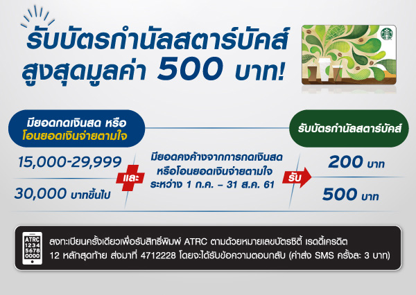 • ยอด 30,000 บาทขึ้นไป และมียอดคงค้างจากการกดเงินสด หรือโอนยอดเงินจ่ายตามใจระหว่าง 1 ก.ค. - 31 ส.ค. 61 รับบัตรกำนัลสตาร์บัคส์ 500 บาท