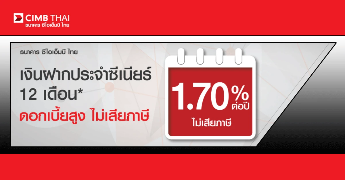 โปรโมชั่นบัญชีเงินฝากประจำซีเนียร์ 12 เดือน* จากธนาคารซีไอเอ็มบี ไทย สำหรับลูกค้าบุคคลธรรมดาที่มีอายุตั้งแต่ 55 ปีบริบูรณ์ขึ้นไป ณ วันที่เปิดบัญชี ให้ดอกเบี้ยสูง และไม่เสียภาษี